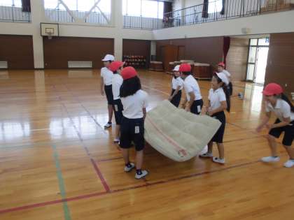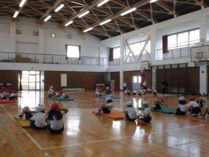 体育館で、2年生がマット運動の授業をしていました。2年生となると、準備もてきぱきと自分たちでできていて、感心しました。