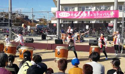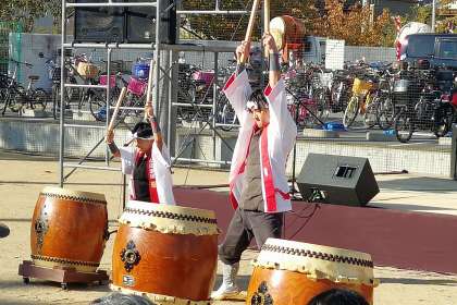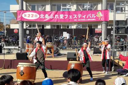 太鼓集団「魁」の演奏は、迫力がありました。北条小の子どもたちも参加しています。