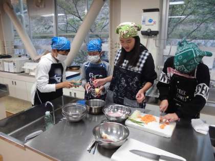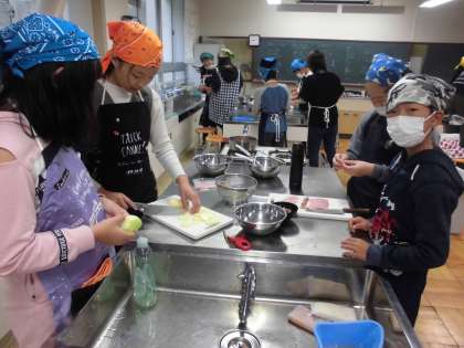 6-3が調理実習をしていました。ジャーマンポテト、エノキのベーコン巻、ほうれんそうのおひたしです。慎重に包丁で切って、野菜をゆでたりエノキにベーコンをまいたりしていました。おいしくできたでしょうか?