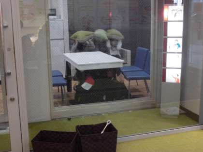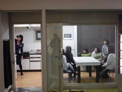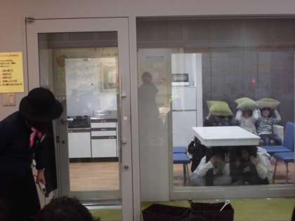 ここは地震体験の部屋です。震度7の揺れを体験できます。テーブルの下にもぐったり、クッションで頭を守ったりして揺れが収まったら、避難路の確保、ガスの元栓閉め、ストーブの消火をします。