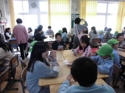 毎年行われている、北条幼稚園との給食交流。来年度小学生になる幼稚園児にとって、小学校の給食は、楽しみでもあり、ちょっと不安もあり。そんな不安を打ち消すように、5年生は、おもてなし精神を発揮。待ち時間にも紙芝居や折り紙、トランプで楽しませていました。