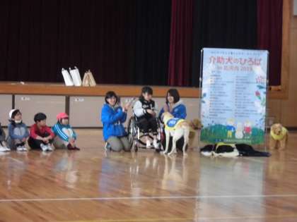 次に、各クラスから1名ずつ出て、介助犬への指示体験をしました。物を拾うように指示することを体験できました。
