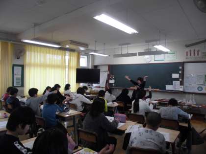 ホワイトボードからふと横を見ると、かわいらしい人形たちが。図工で作ったみたいですが、ちょこんと座っている様子が、何とも微笑ましいです。教室では、外国語の授業をしていました。先生のアクション付英語は、わかりやすい!