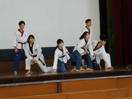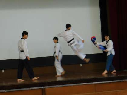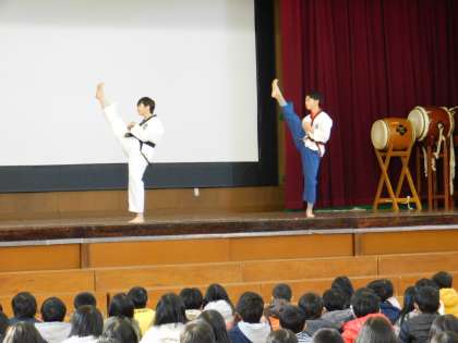 12月の集会に引き続き、みんないきいき集会をしました。今日は、金剛学園中学校・高校のみなさんが、日ごろクラブで取り組んでいるテコンドーと韓国舞踊を見せてくださいました。テコンドーは、脚の上がりがすごかったですし、音楽に合わせての型もかっこよかったです。