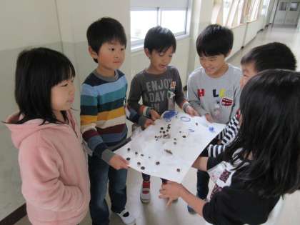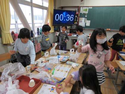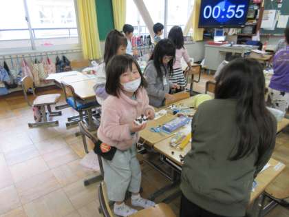 生活科で、みんなが楽しめる遊び道具を作っていました。ふわふわの綿が付いたドングリ迷路やけん玉など、自然にあるものを利用して上手に作っていました。