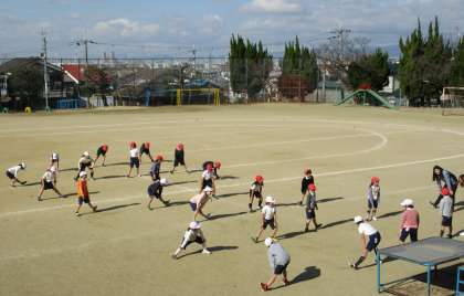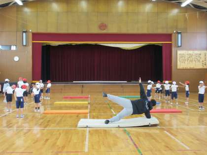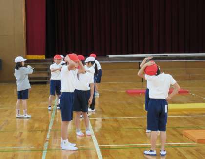 2-1は体育館で、2-2は運動場で体育です。準備体操も上手にできるようになってきました。体育係が活躍です。