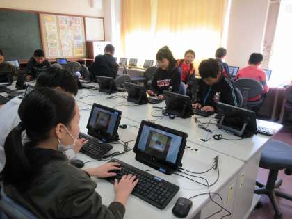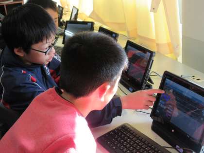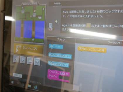 次の時間も、なにやらせっせとパソコンに向かっている別のクラスの6年生。プログラミングのソフトを使っての学習です。画面上のロボットをうまく動かすために、あらかじめ命令(『前に進む』『右に曲がる』など)を打ち込んでおきます。私もやって見ましたが、なかなか難しいです。子どもたちは何度かしているのか、すいすいと進んでいました。