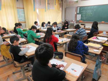 いつもの通り、校内をぶらぶらしながら4年生のろうかまできますと、4−1が、シーンとしているのに電灯がついている。「教室にいない時は、消さないと」と思って、ドアを開けたら、いました!算数です。しーんと静かにノートに向かっています。驚くと同時に感心しました。4−2もいないのかと思って開けてみますと、いました!友だちの国語の感想文を読んで、メッセージを書き込んでいました。両クラスともあまりに静かで、足音を立てるのも、気兼ねするほどでした。