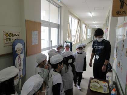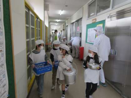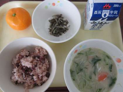 3学期の給食が始まりました。今日は、『赤飯・ぞうに・田作り・みかん・牛乳』と、お正月メニューです。おいしくいただきました。