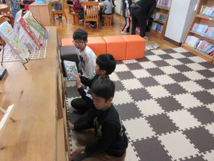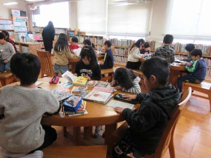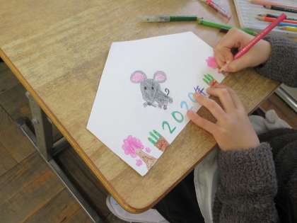 2−1が、絵馬を書いていました。かわいいネズミの絵です。裏には、願いや目標が書かれています。2−2は、図書です。静かに本を読んでいます。後ろのスペースでは、本の整理をしてくれている子もいました。ありがとう。