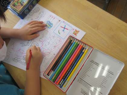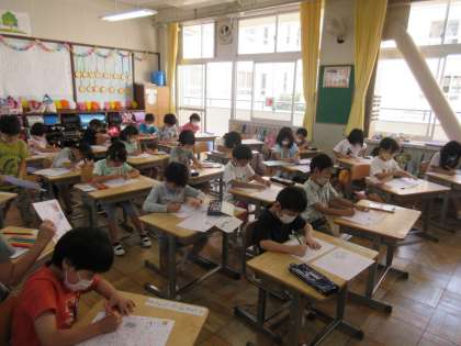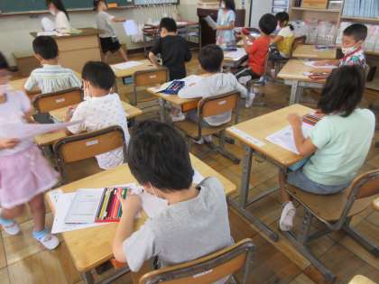 1組は、ひらがなのプリントをしていました。先生に丸をもらったら、挿し絵に色を塗っていました。