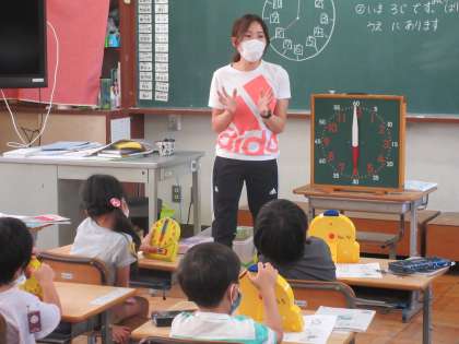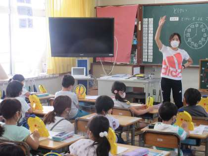 2組は、算数。時計の学習です。「きのうみんなは、何時に寝ましたか」。自分のことを出しながら、模型の時計を使って学習していました。