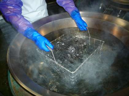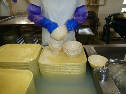 みんなが食べ終わった後、給食室では食器の洗浄です。つけ置きの後、洗剤でていねいに洗います。その後お湯にくぐらせます。最後に保管庫で80度で90分消毒して、明日の給食を待ちます。