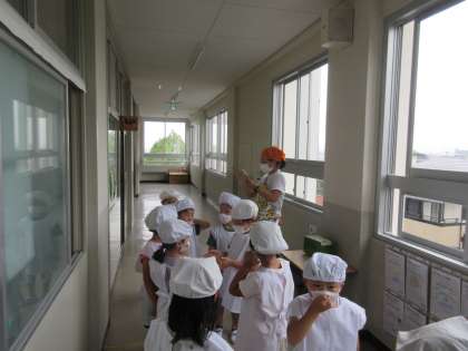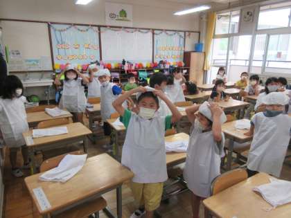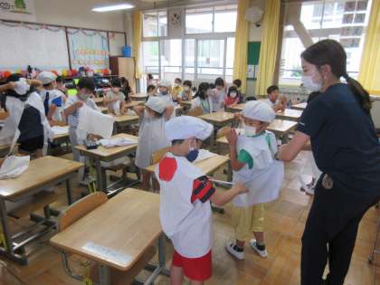 当番は、給食エプロンをつけます。後ろのリボン結び、ちょっと難しいね。