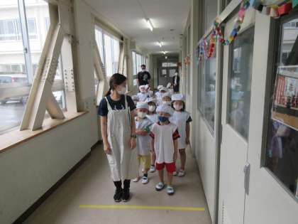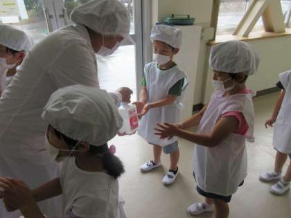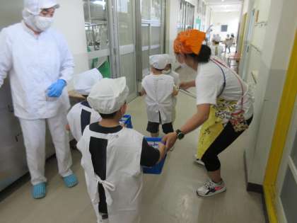 給食室に並んで取りに行きます。栄養士さんに、アルコールをつけてもらって手指を消毒し、給食を受け取ります。気をつけて!