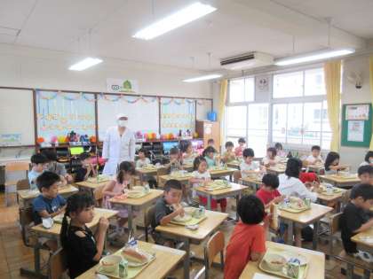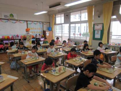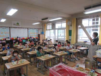 「いただきます」の後は、マスクをとって食べ始めます。今は、お話しながら食べることはできないので、静かに食べていました。牛乳パックのストローをさすのや、パンの個包装を開けるのが難しかったみたいです。