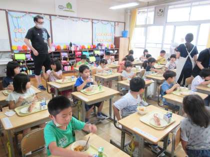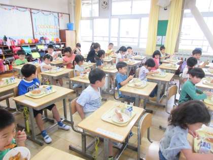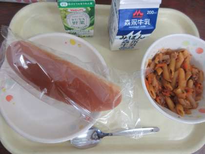 今日のメニューは、「ミートペンネ、コッペパン、牛乳、野菜ジュース」でした。1年生のみなさんも、おいしくいただきました。