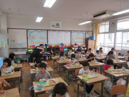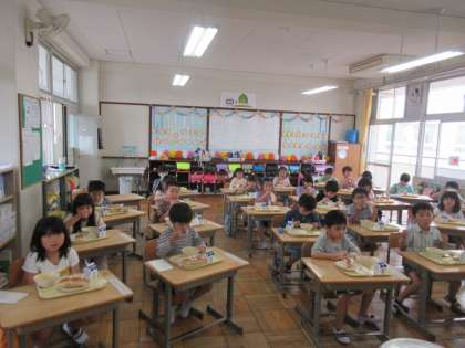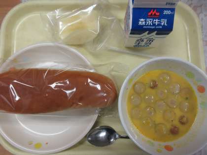 給食2日目。今日のメニューは、カボチャのクリーミースープ、コッペパン、りんご、牛乳でした。