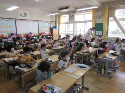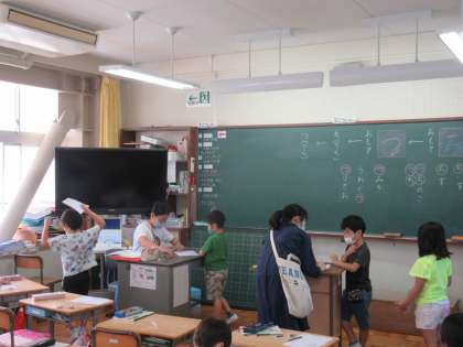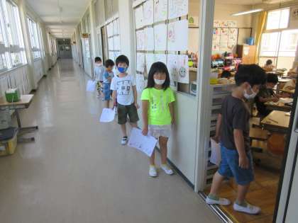 ひらがなのプリントのまるつけです。一人ずつ先生に見てもらう時も、印のところに立って距離をとって並んでいます。算数の「5になる数」もしっかりがんばっていました。1年生、さすがです。