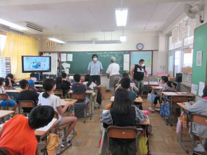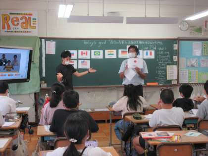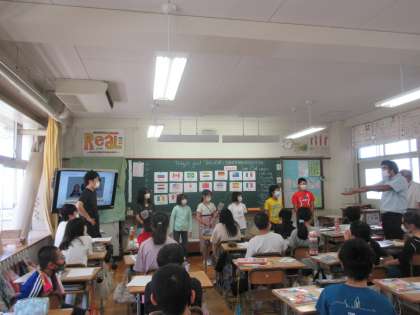 5年生と6年生の外国語に来てくれる北条中の先生は、それぞれ違うのですが、AETの先生は、どちらの学年にも来てくださいます。今日は、自己紹介のフレーズや世界の国の学習です。ところで、単語の発音をする時の6年担任の謎のリアクションが気になります(?!)