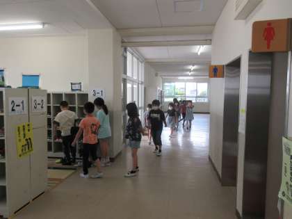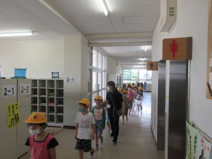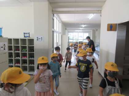 まずは、すぐ帰れるように下靴にはき替えました。1年生は、初めての事なので、「この靴であがっていいの?」と、不思議そうでした。今日はいいんですよ。今日だけね。