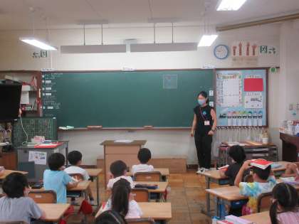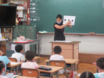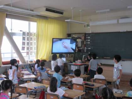 1−1では、書画カメラとテレビを使って、子どもたちの考えたクイズを楽しんでいました。大写しになるのでわかりやすいですね。その後は、ひらがな学習。今日の字は、「と」でした。