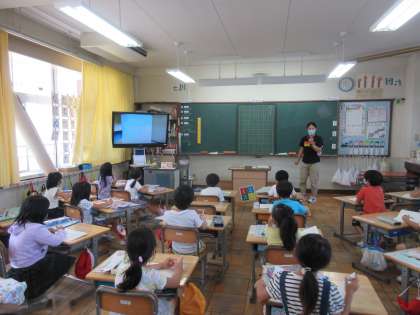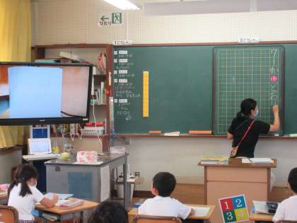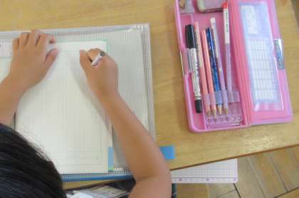 連絡帳を自分で書くようになりました。どこに日付を書くか、時間割をどう書くか、テレビで写し、実際に大きく書いて見せています。子どもたちも緊張感を持って、ていねいに書いていました。