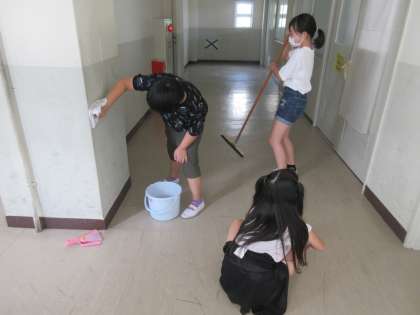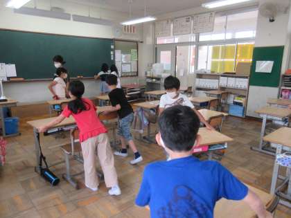 4年生の教室に回ってみると、ここでもお掃除の真っ最中。さすがに4年生は、自分たちうでてきぱきとお掃除ができています。すばらしい!