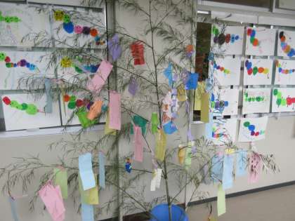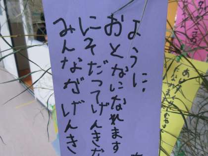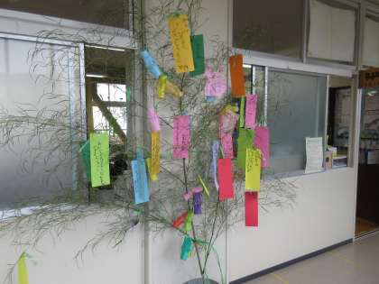 昨日、2年生の笹かざりを紹介しましたが、1年生の教室の前にも飾られていました。願い事を見ると、「みんなとなかよくなれますように」「みんながしあわせにくらせますように」「にじがみたいです」…。どれもかわいいものばかり。きっと、星に届きますよ。