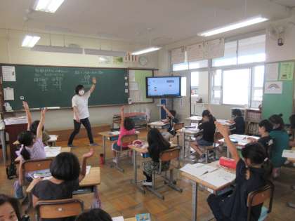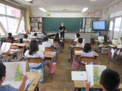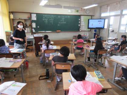 算数は、くり下がりのある引き算。元気よく手が上がっています。国語の本を読むときは、姿勢をきちんと。素晴らしいです。
