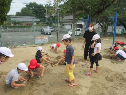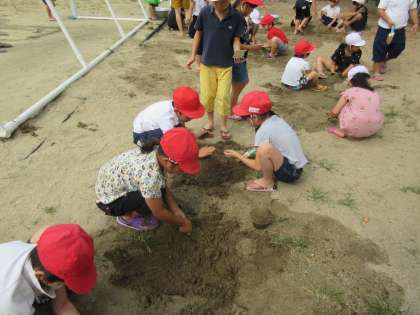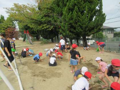土や砂の感触を思いっきり楽しみました。保護者の皆さま、お洗濯のお世話をかけます。申し訳ありません。