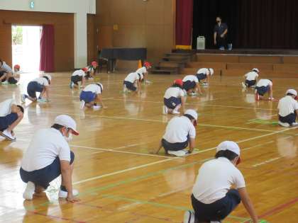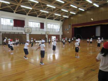 曲に合わせてリズム縄跳びをします。どこで立ち上がるか、タイミングが難しいですが、よく合わせています。
