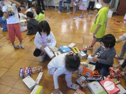 算数で、「はこの形」を学習したので、その続きで箱を使って何か作ろうとしています。今日は、好きな箱を選んで何を作ろうか考えました。