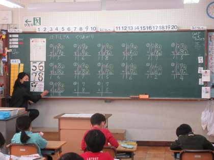 算数では、くり上がりのあるたし算を学習しています。1の位から10の位へ「へんし〜ん」と言いながら、くり上がります。
