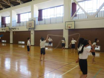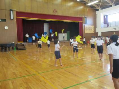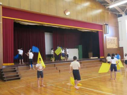 今年は、新型コロナウイルス感染拡大防止の観点から、従来のように密集した演技(組体操など)ができません。そこで、子どもたちを知恵を出し合い工夫して考え出したのが、フラッグ、フラフープ、大縄を使った表現です。それぞれチームで技を考え、パート練習をしていました。実行委員が中心になって進める姿に、北条中学校の先生方が、「すごいなあ」と、感心しておられました。