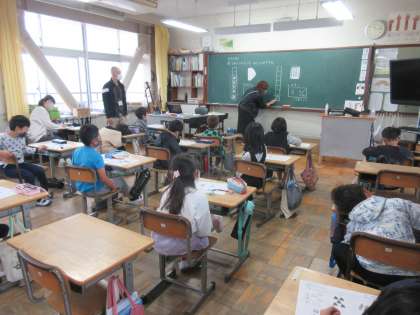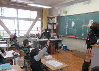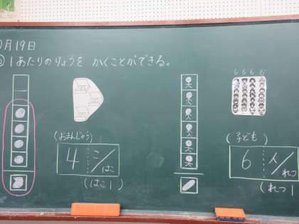 いよいよかけ算「九九」の学習に入りました。まずはじめに、「1あたりの量」についてしっかり押さえておくことが大切です。今日は、1箱あたりまんじゅう4個。2箱で8個・・・。はじめは、丁寧にイラストで描いていきますが、次第に黒く塗りつぶした形に簡易化し、一般化してタイルへと移行していきます。時間はかかりますが、ここが肝心です。