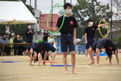 今年の運動会で、一番団体演技に悩んだのは6年生ではないでしょうか。新型コロナウイルスの感染防止のため、組体操が大技ができない。それでも、今できることを自分たちで考えました。子どもたちが、考えた演技です。