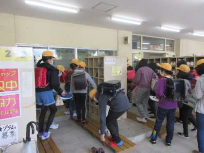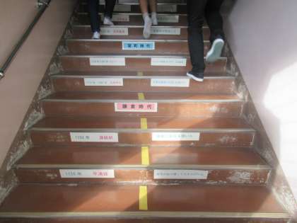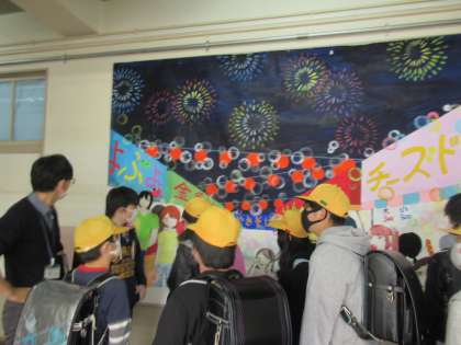 6年生用の靴箱も用意してくれています。中学生の邪魔をしないよう、そーっと教室に向かいます。中学校には、先輩たちの作品がたくさん飾られています。