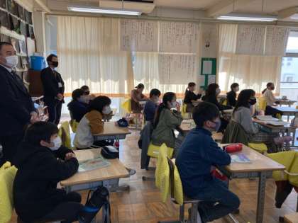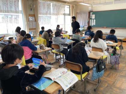 5-2は、なぜか先生が靴を飛ばしている画像をみんなで見ていましたが…。靴を飛ばした距離の平均を計算するそうです。算数の学習です。5-1は、家庭科。これからミシンを使う学習に入るそうです。
