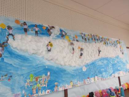 1年生のろうかにも、みんなで考えた平和についてのワークシートが掲示されていました。教室には、くじらぐもが浮かんでいます。