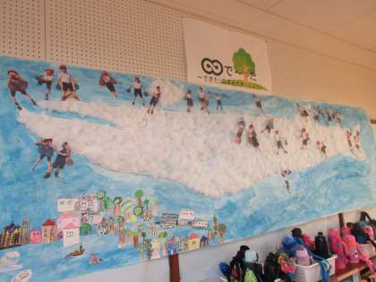 両クラスで一緒に取り組んでいます。くじらぐもには、子どもたちが写真で乗っています。