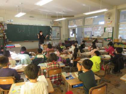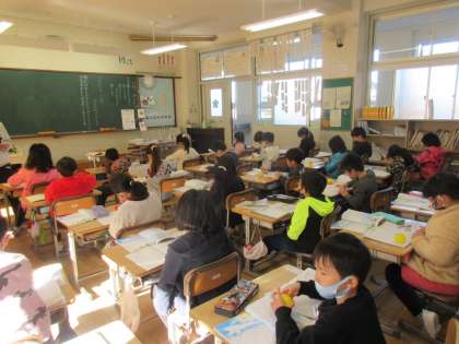 1年生は、国語。1組は、「きって」「きっぷ」など、つまる音(促音)の指導でした。手をたたいて、「きって」と、言いやすいように練習していました。2組は、「くじらぐも」の登場人物の気持ちを考えるために、ノートに絵を貼っていました。