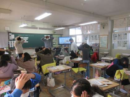 5−1でも、外国語の時間にポインティングゲームのポーズをしていました。5年生は、建物の名前をさすゲームです。