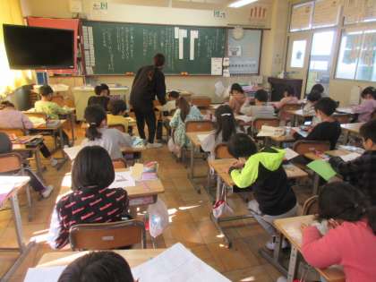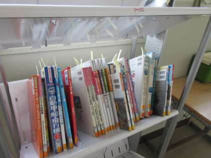 高学年のろうかには、すぐ活用できるように、図鑑などが配置されていることが多いのですが、1年生のろうかにも図鑑が置かれていました。今学習している『自動車くらべ』に関係する本です。しかも、付せんがついています。