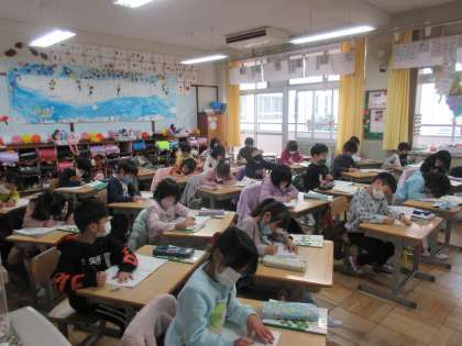 1−1は、カタカナの練習をしていました。ノートに、「カタカナテスト」をしています。先生が言う言葉をカタカナで書くのです。真剣です。