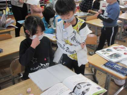 1−2は、自動車の図鑑を使って調べ学習をしています。使いこなせるなんてすごい!