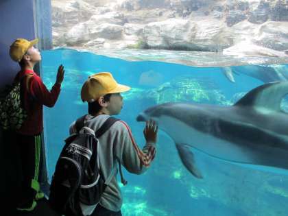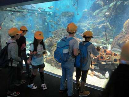 さて、海遊館では大きなジンベイザメをはじめいろいろな海の生き物を見ました。グループで先生からもらったクイズを解きながら進みました。