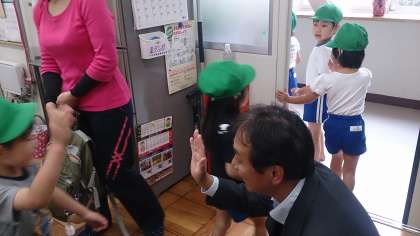 5月9日(金)四条保育園の園児さんが「5月の園だより」を届けに本校に来てくれました。初めての学校はどうだったかな?終わりはハイタッチして帰ってくれました。