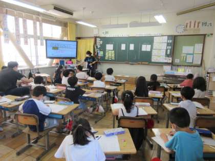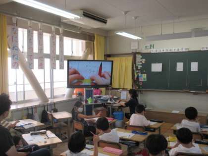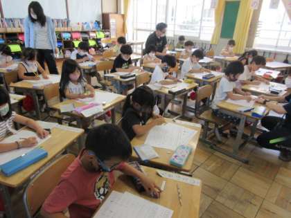たし算のプリントをがんばっているところです。小さなタイルを自分で動かしながら、考えています。
