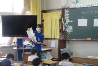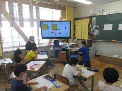 たし算の問題です。今日もプリントをがんばっています。タイルで数を確かめながら進めています。
